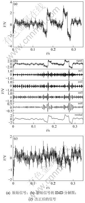 采用 EMD方法对含噪信号进行消噪处理, 信号经EMD分解后自适应地得到6阶模态函数(图3(b))。从图3(b)可以看出:第4阶IMF表现为规整的50 Hz正弦波,且幅值很大;第5阶IMF为其谐波,说明正弦噪声主要存在第4阶IMF中。对第4和第5阶IMF强制置零,最后重构得到消噪后的信号。图3(c)所示为受周期正弦噪声干扰的大地电磁信号经EMD消噪后的效果图。消噪后信号的统计场参量最大值为 1.262 089 V,最小值-1.583 672 V,而均值只有 -0.139 708 V,能量为8.052×108 mV2,噪声能量占总能量的78.3%。可见:改正后信号显得较为平稳,看不到周期波形,突出了被噪声掩盖的有用信息。显然,EMD得到的IMF序列为噪声识别和弱信号的提取提供了条件。