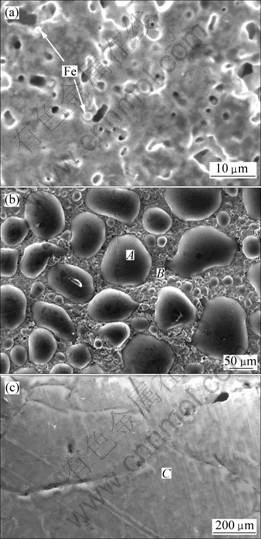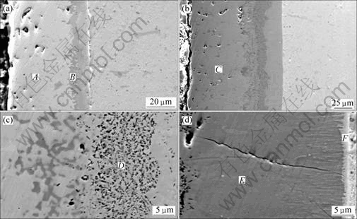 图3所示为Mo层、硅化后的涂层、硅化后的微孔区和硅化后内层的截面形貌。由图3(a)可见,真空烧结后钼层厚度约为50 μm,较致密,但内部仍有少量的孔洞。钼层与基体之间形成深色的过渡区,表2所示的能谱结果表明其中含Nb和Fe以及少量的Ni和Cr,Fe和Ni等杂质元素是在钼粉球磨细化过程中引入的。由于Fe和Ni等的自扩散系数D0比Mo的D0要高,在铌中的扩散激活能均比钼的低得多[14],故在高温下Mo层中的杂质元素向基体和表层2个方向扩散。向基体方向扩散的杂质元素在Mo层与基体界面处偏析;向表层扩散的Fe等元素形成低熔点共晶相,在Mo层表面熔融,冷却后形成圆球颗粒(如图2(a)所示)。