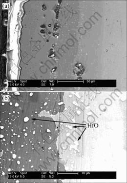 氧化后低硅化物层的宽度由2 μm增加到46 μm,这是因为在氧化过程中,富Si层中的Si在化学位驱动下向基体内扩散,使Nb5Si3相层增厚。此外,Si向表层扩散以弥补氧化时主体层中Si的损失。Si的扩散也是通过空位的反向流动来实现的,这些空位同样会在空位阱处聚集。由于基体中Hf元素与氧有较大的亲和力,氧化过程中有极少量的氧扩散至涂层内层或基体时,氧首先与Hf结合生成白色的HfO质点,在涂层内层或基体中弥散分布,如图4(b)所示。