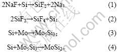 e. 由于在钼层表面不断有Si沉积,在化学位驱动下,固态扩散反应不断进行,MoSi2层厚度随着时间的延长而增加。气相沉积反应过程如下[20-21]: