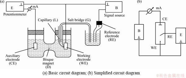 The potentiodynamic polarization (PP) was conducted in the 3.5 wt.% NaCl solution at 25 °C. The specimens were reduced potentiostatically at -1.0 V for 3 min initially to remove the air-formed oxides on the surface before the polarization. Then, the specimens were stabilized in the electrolyte, where the open-circuit potentials (OCP) were measured. The CPP test was performed at 0.5 mV/s from -1.2 V to 0.2 V (vs Ag/AgCl), and then the scan direction was reversed. After that, the Ecorr and icorr were calculated by extrapolating the Tafel line [17]. Each type of electrochemical measurement was repeated at least three times to ensure the reproducibility and consistency of the data. The diagram of three-electrode circuit is shown in Figure 1.