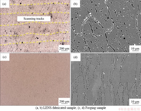 Figure 2 shows the microstructure of Al7075 alloy prepared by LENS and forging technology, respectively. Pores are observed in the LENS-fabricated samples, and the average width of scanning tracks is about 300 μm. The precipitates exist both within the grains and along the grain boundaries. In contrast, the forging sample is fully dense with a uniform columnar microstructure.