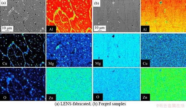 Figure 3(a) shows the elemental distribution of LENS-fabricated samples obtained by EPMA spectrum analysis. It can be seen that Zn is evenly distributed in the Al matrix, and Cu is segregated at the grain boundaries. Part of Mg is dissolved in the Al matrix, and the rest of Mg is involved to form intermetallic compounds at the grain boundaries. The environment-sensitive embedding energy (ESE) of Cu and Mg is relatively low at the grain boundary, while that of Zn is lower within the grains [18]. The lower ESE usually indicates more stable dopant atoms [19]. Therefore, a large amount of Cu segregation occurs at the grain boundary, while Zn is less distributed at the grain boundary. In addition, the existence of Zn also improves the solubility of Cu in Al and combines with Mg to form MgZn2, which inhibits the diffusion of Mg atoms [20]. However, there is no significant enrichment of Zn in the spectrum analysis, which could be attributed to the low vapor pressure of Zn element. During the laser forming process, a considerable amount of Zn vaporizes, resulting in the burning loss of Zn content. The analysis accuracy of EPMA spectrum is difficult to identify residual Zn enrichment. Figure 3(b) shows the element distribution diagram of forgings. It can be observed that the content of Al, Mg, O and Zn is small in the coarse precipitates, and uniformly distributed in the surrounding Al matrix. Only Cu element enrichment is observed. Combined with element distribution, it can be inferred that the coarse precipitated phase may be θ phase (Al2Cu). According to the available literature [21-23], the fine second phase is preliminarily concluded as η phase (MgZn2) in forgings.