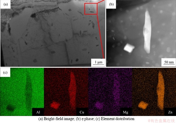 Figure 4 shows the TEM micrographs of LENS-fabricated samples. It can be observed that precipitate-free zone (PFZ) is formed at the grain boundaries. The Cu-enriched phases are seperated by the PFZs and form a discontinuous chain-like structure, which is closely related to the intergranular corrosion. The wide FPZ may make it difficult to sustain oxidation reaction at the grain boundary, which leads to low intergranular corrosion sensitivity [24]. The rod-like intermetallics particles are uniformly distributed within the grains. Figure 4(b) shows the element distribution of boxed area in Figure 4(a). The intermetallics particle is mainly composed of Mg and Zn, which is consistent with the element ratio of η phase (MgZn2). In addition, a small amount of Cu is also dissolved in the η phase, which is beneficial to reduce the potential difference between the η phase and α-Al matrix.