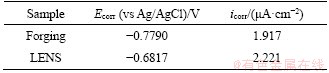 In order to further characterize the corrosion resistance of Al7075 alloy, self-corrosion potential and self-corrosion current density were obtained by Tafel extrapolation method, as shown in Table 2. It can be seen that the self-corrosion potential of forgings is -0.7790 V, which is lower than-0.6817 V of LENS-fabricated samples. Therefore, the forgings are more prone to corrode in terms of the lower self-corrosion potential. However, the self-corrosion current density of the forging is 1.917×10-6 A/cm2, which is lower than that of the LENS-fabricated samples (2.221 μA/cm2), demonstrating that the forgings have lower corrosion rate.
