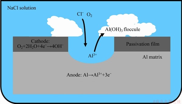3) The corrosion occurs preferentially at the hole defects. The corrosion process is regarded as follows: the incomplete passivation film at the defect lead to the formation of a local cell composed of the internal Al, corrosion solution and the surrounding passive film. Al is dissolved and then hydrolyzed to produce Al(OH)3, and a large amount of Cl- migrates into the hole to maintain the electrical neutrality. While the deposition of Al(OH)3 in the hole leads to the formation of a blocked cell, which further aggravates the corrosion.
