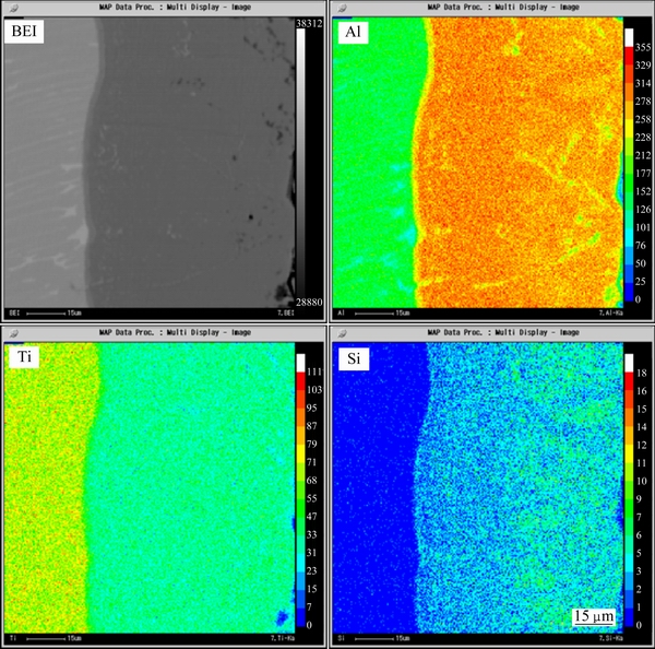 Fig. 3 EPMA elemental maps of Al, Ti, and Si of diffusion coating