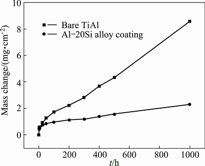 Fig. 4 Isothermal oxidation kinetics curves of γ-TiAl alloy with and without diffusion coating after oxidation at 900 °C for 1000 h