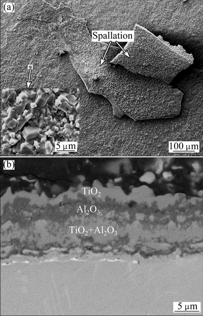 Figures 5(a) and (b) show the surface morphology, a high magnification (insert) and cross-section of the oxidized bare γ-TiAl alloy at 900 °C for 500 h, respectively. From Fig. 5(a), it could be seen that sever spallation occurred on the surface of the oxidized bare alloy. From the high magnification image (insert) in Fig. 5(a), large quantities of TiO2 crystals were observed on the surface. From Fig. 5(b), a 15 μm-thick multilayer oxide scale formed after oxidation. It consisted of an outer TiO2 layer, an intermediate Al2O3-rich layer, and an inner TiO2 and Al2O3 mixed-oxide layer, as described in Ref. [6]. This multilayer oxide scale is prone to crack and spall off. Thus, γ-TiAl alloy shows poor oxidation resistance at 900 °C in air.