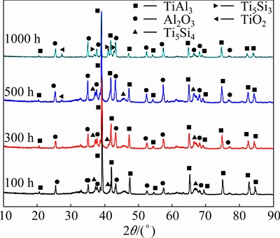 Fig. 6 XRD patterns of diffusion coating after oxidation at 900 °C for 100, 300, 500, and 1000 h, respectively