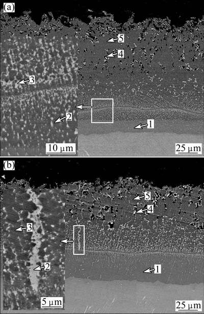 However, the brittleness and fast degradation during the high temperature exposure decreased the oxidation resistance of the TiAl3 coating. To improve the properties of TiAl3, the coating modified with the third element was widely reported [17-22]. XIONG et al [17,18] reported liquid-phase siliconized by Al-Si alloys on TiAl-based alloy and studied its oxidation resistance. SWADZBA et al [19] studied the long-term cyclic oxidation of Al-Si diffusion coatings deposited by arc-PVD. XIANG et al [20] studied co-deposition of Al and Si to form oxidation-resistant coatings by pack cementation. GORAL et al [21,22] studied the influence of Si on structure and oxidation resistance of aluminide coatings. LI et al [23] reported the microstructure and high temperature oxidation resistance of Si-Y co-deposition coatings prepared on TiAl alloy by pack cementation process. The results showed that the aluminide coating modified with silicon could improve the oxidation resistance of the bare alloy significantly.