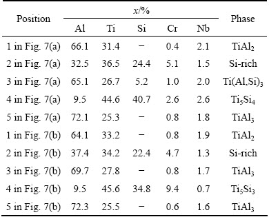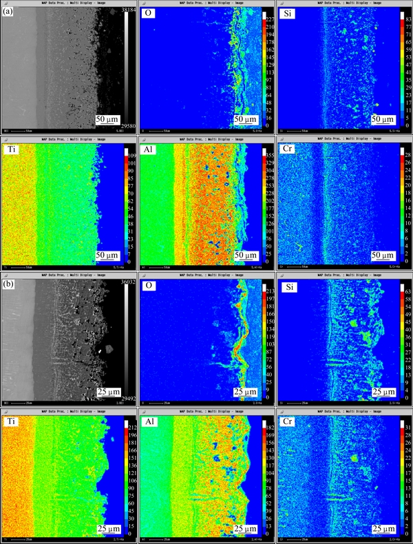In order to form a Ti(Al,Si)3 diffusion coating on the substrate, a heat-treatment was performed at 750 °C for 12 h. From Fig. 1(b), a new layer (80-90 μm) formed with the disappearance of the Al-20Si alloy coating. The chemical composition (68.2% Al, 22.9% Ti, 6.4% Si, 1.1% Cr, 1.4% Nb, mole fraction) and XRD pattern in Fig. 2(b) indicated that the new layer was Ti(Al,Si)3 whose Al atoms had been partly substituted by Si atoms in the ordered lattice of TiAl3. It was reported that the solubility of Si in the TiAl3 phase could reach up to 15% (mole fraction) [25]. The chemical composition of the newly formed layer in this work was in agreement with this result. Figure 3 shows the elemental maps of Al, Ti, and Si of the diffusion coating. It could be seen that the distribution of Al and Si in the diffusion coating was uniform.