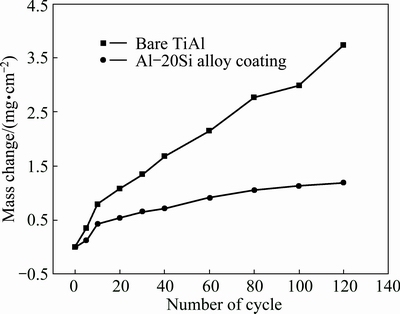 Fig. 9 Cyclic oxidation kinetics curves of γ-TiAl alloy with and without diffusion coating after oxidation at 900 °C for 120 cycles