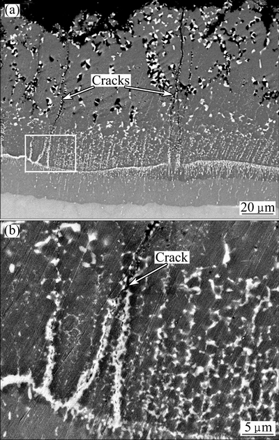 Figure 10 shows the surface morphologies of the diffusion coating after 1000 h oxidation and 120 cycles oxidation at 900 °C. From Fig. 10(a), it could be seen that the surface was comparatively rough. No cracks or spallation could be found after 1000 h oxidation. The surface morphology of the coating after 120 cycles oxidation was similar to that after 1000 h oxidation except some significant cracks were observed as shown in Fig. 10(b). Although cracks generated, no spallation was observed. This indicated that the oxide scale had good adhesion to the coating.