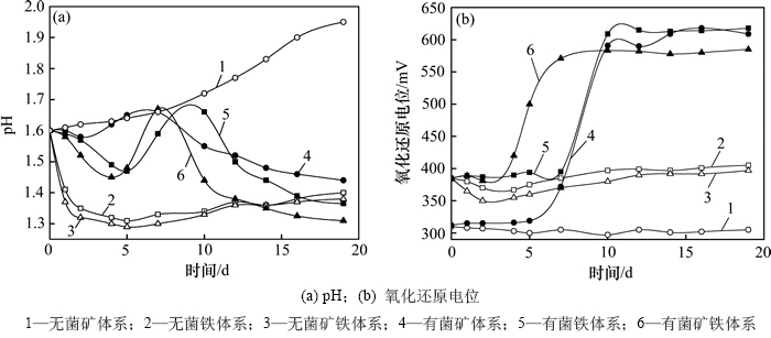 与有菌矿体系及有菌铁体系相比,有菌矿铁体系在浸出前期,低电位持续的时间非常短,可能是由于在低电位条件下Fe2+被氧化为Fe3+[7],使氧化还原电位提前升高;在第6~19天,氧化还原电位维持在560~575 mV,均比其他2种有菌体系低,由于Fe3+水解而引起的较低pH促进了黄铜矿的溶解,产生一定量的Fe2+,且在大量铁矾存在与低pH的条件下,细菌氧化Fe2+的活性较弱[13]。