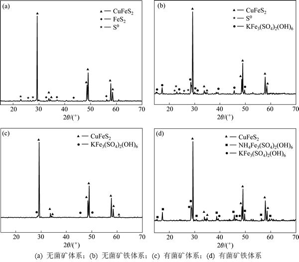 不同体系中黄铜矿浸渣的XRD检测结果如图3所示。从图3中可以看出:无菌矿体系中的浸渣含有黄铜矿、黄铁矿和硫单质;无菌矿铁体系中的浸渣含有黄铜矿、硫单质和黄钾铁矾;有菌矿体系中的浸渣含有黄铜矿和黄钾铁矾;有菌矿铁体系中的浸渣含有黄铜矿、铵黄钾铁矾和黄钾铁矾。可见,向黄铜矿的浸出体系中加入总铁离子质量浓度为12 g/L的溶液(ρ(Fe2+):ρ(Fe3+)=1:1)后,无论是否接种细菌,均有大量铁矾产生。