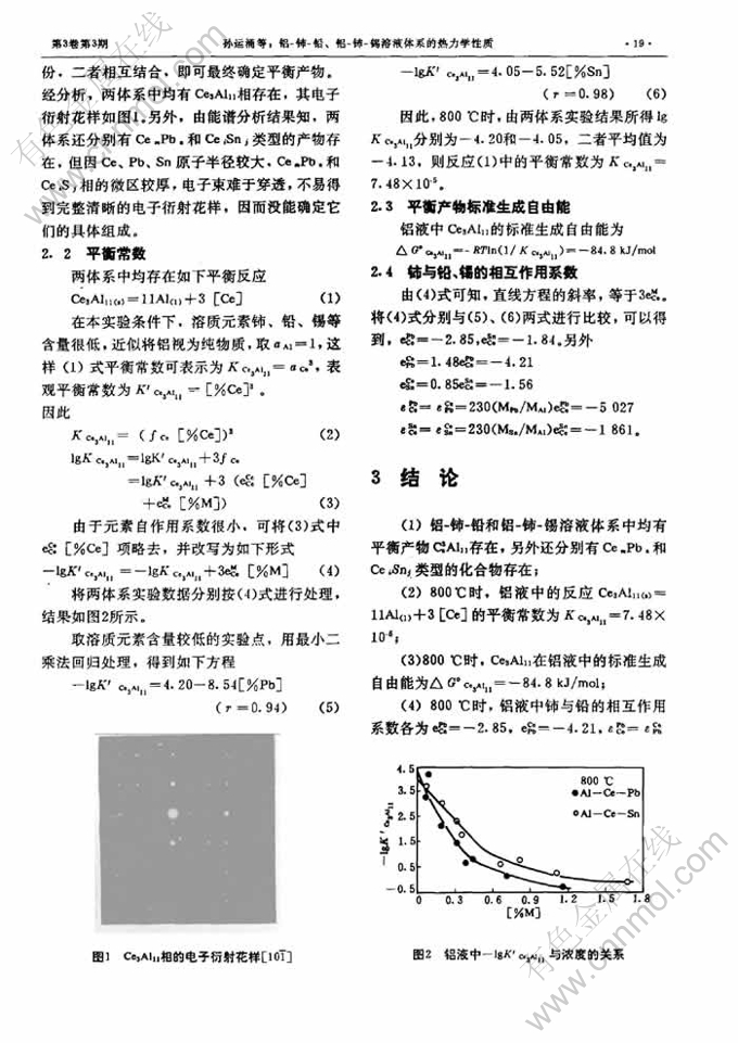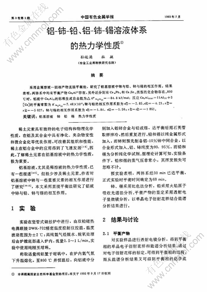 关键词:铝基溶液 铈 铅 锡 热力学性质