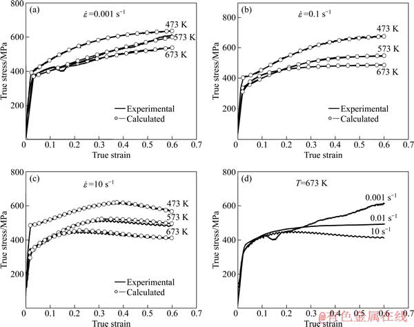可见,Ti2448合金在高、低应变速率下呈现出不同的变形特性。田宇兴等[13]对Ti2448合金在热变形条件下变形特性的研究同样表明,当合金在高、低应变速率下呈现不同变形特性时,应分不同的应变速率构建其本构模型。因此,本文作者在构建描述Ti2448温变形的本构模型时,分高、低应变速率进行。
