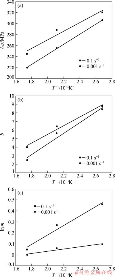 Fig. 3 Relationship between Δσ (a), b (b) and ln m (c) and 1/T in modified Voce model