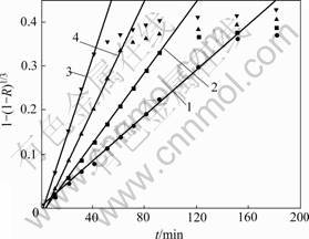 为查明煤还原钛铁矿的反应控制环节,应用收缩未反应核动力学模型对煤还原钛铁矿的等温还原试验结果进行分析。结果表明:由收缩未反应核模型中的界面化学反应控制模型所得结果与等温还原实验结果较符合。这表明在试验温度范围内,该反应过程受界面化学反应控制。按收缩未反应核模型界面化学反应控制分析,不同温度下的还原试验结果见图2。