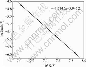 图3所示为根据图2中各直线斜率求出的各温度下的速率常数k与温度的Arrhenius关系曲线,该曲线斜率为-E/R。图3中,曲线斜率为-1.514 6,由此可求出煤还原钛铁矿中铁氧化物的表观反应活化能为