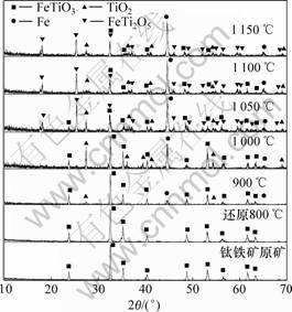 为了解钛铁矿还原过程中产物的物相变化规律,揭示钛铁矿还原反应历程,采用XRD测定攀枝花钛铁矿精矿还原前后的物相组成。图4所示为攀枝花钛铁矿精矿和用煤还原攀枝花钛铁矿精矿以300 ℃/h的速度升温到不同温度后所得的还原产物的X线衍 射图。