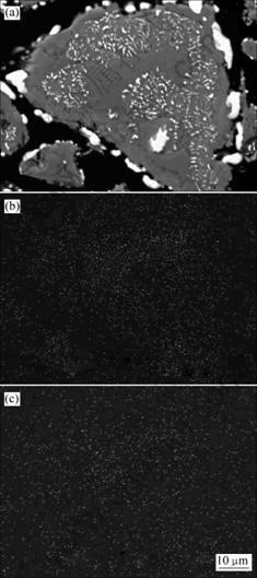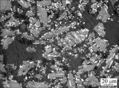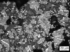 图7所示为攀枝花钛铁矿精矿在1 100 ℃还原 60 min后还原产物的显微结构照片。可见:在此条件下,还原产物中仍有部分颗粒存在未反应的内核,生成的金属铁除部分呈粒状、条状附着在颗粒的边界处或裂缝处外,其余部分则呈点状、脉状向颗粒内部发展。与1 000 ℃时还原60 min相比,生成的金属铁粒子总体上有所增大,但附着在颗粒边界处或裂缝处的金属铁粒子相互之间仍未形成连接。