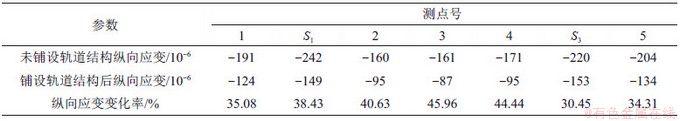 表1和表2所示为未铺设轨道结构和铺设轨道结构后,在900 kN试验荷载作用下,简支箱梁跨中截面顶板与底板各测点应变以及变化率。从表1和表2可以看出:轨道结构铺设后,因其与简支箱梁共同工作抵抗外荷载作用,简支箱梁跨中截面顶板与底板纵向应变与未铺设轨道结构前相比均有较大幅度降低。