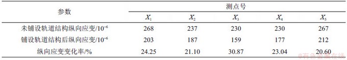 本次试验主要测试如下参数:1) 简支箱梁应变;2) 轨道结构应变;3) 铺设轨道结构后梁体与底座板的纵向相对位移;4) 铺设轨道结构前后结构的挠度。