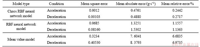 For the purpose of comparing the prediction property of the three models further, the mean square error, mean absolute error and mean relative error were adopted as the index to judge the performance of the models. The error comparison of acceleration condition and deceleration condition models are listed in Table 1, respectively. Both the acceleration and the deceleration conditions, have shown clear comparison of the predictive performance of the three models.