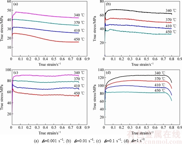 图2所示为喷射成形7055铝合金的真应力-真应变曲线。如图2所示,应变速率保持恒定的条件下,随着变形温度的升高,合金的峰值应力逐渐减小;在温度保持恒定的条件下,随着应变速率的下降,合金的峰值应力逐渐减小。当温度为340 ℃,流变应力会随着应变增加到达一个峰值,然后趋于稳定的应力值,属于典型的动态回复时的真应力-真应变曲线。当温度为450 ℃,流变应力会随着应变的增加到达峰值后迅速下降然后再趋于稳定,属于典型的动态再结晶时的真应力-应变曲线。对于中间温度,则分别呈现出动态回复和动态再结晶的特征。出现这种情形的原因在于,在更高的变形温度下,合金形变时热激活过程加强,可以激活更多的滑移系,便于位错向晶界附近聚集,因而更容易形成亚晶粒,并且亚晶粒在高的变形温度下更容易长大[17],从而更有利于再结晶晶粒的形成。