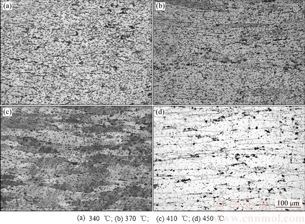 Fig. 4 Optical microstructure of spray-formed 7055 aluminum alloy at strain rate of 0.001 s-1 and different temperatures