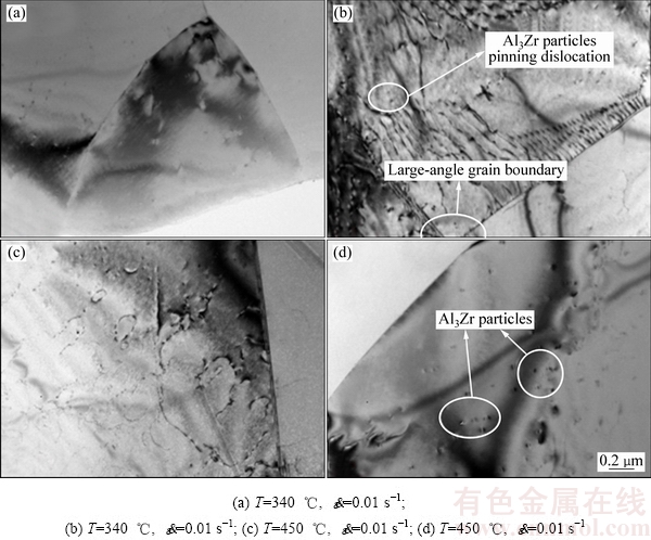 结合表1和以上分析,不难发现动态再结晶过程在lnZ值越小的时候更容易发生。即随着温度升高或应变速率降低,该合金的组织变化趋势为由动态回复的特征组织向动态再结晶的特征组织转变。值得注意的是,图6(d)中可以观察到许多纳米级、弥散分布、与基体共格的Al3Zr粒子,该粒子具有L12型立方结构[29-30],对位错和亚晶界具有强烈的钉扎作用,因此可以阻碍变形过程中再结晶的发生。