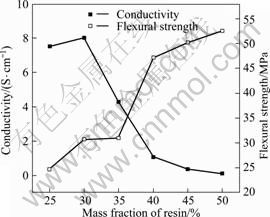 Fig.3 Effect of resin content on conductivity and flexural strength of composite