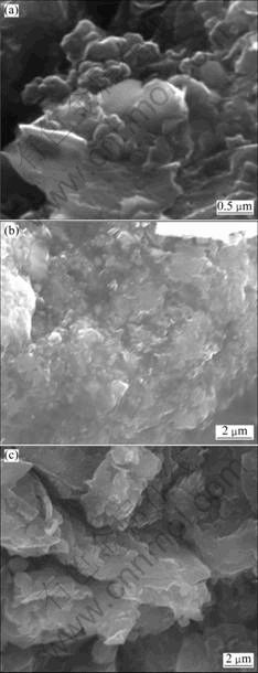 从表2可以看出,与炭黑直接添加在竹炭粉粒中的方式相比,采用炭黑先分散在树脂中的方式制备的复合材料的密度和电导率、抗弯强度分别增加了2%、20%和43%,吸水率和显气孔率有所下降。这是由于在相同炭黑用量的情况下,炭黑直接添加到竹炭粉粒时易发生炭黑团聚(见图6(a)),一定程度上阻碍了石墨化竹炭粉粒之间以及粉粒与树脂之间的结合,因此,复合材料的各项性能均较差。而将炭黑先分散在树脂中时,炭黑以单个炭黑颗粒或者较小的团聚体形式均匀地分散在竹炭表面,且团聚较少(见图6(b)),因此,采用炭黑先分散在树脂中的方式制备的复合材料,其性能有较大幅度的提高。