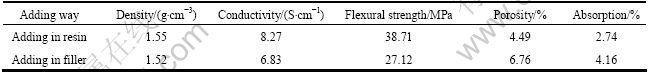 炭黑作为一种纳米级尺度的颗粒, 由于其巨大的表面积、表面能及不规则的枝链状结构[16], 极易形成团聚体, 从而对复合材料的性能产生较大的影响。在粘结剂用量为30%、炭黑用量为5%、成型压力为280 MPa及固化温度为180 ℃的工艺条件下,考察炭黑添加方式对复合材料性能的影响,其结果如表2所列。