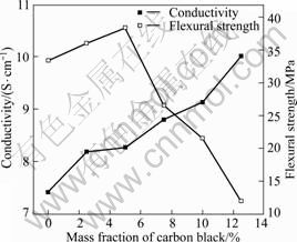 Fig.7 Effect of carbon black content on conductivity and flexural strength of composite