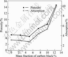 Fig.8 Effect of carbon black content on porosity and absorption of composite