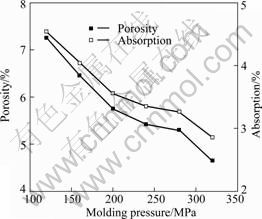 Fig.10 Effect of molding pressure on porosity and absorption of composite