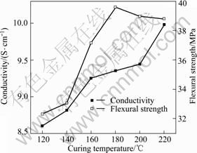 Fig.11 Effect of curing temperature on conductivity and flexural strength of composite