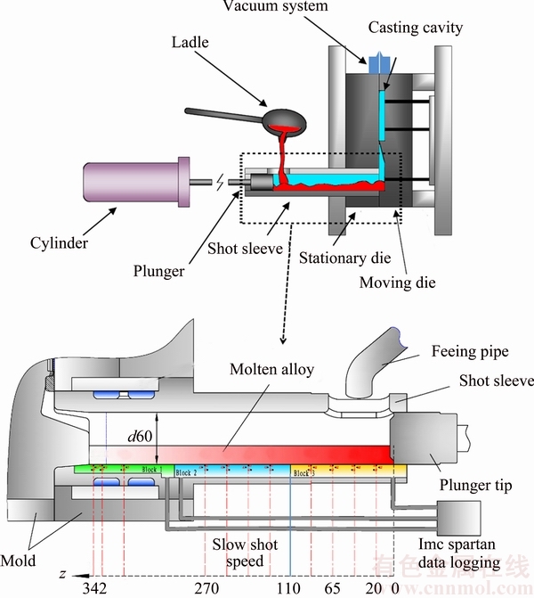 Fig. 1 Schematic of vacuum assisted HPDC process and details about shot sleeve (unit: mm)