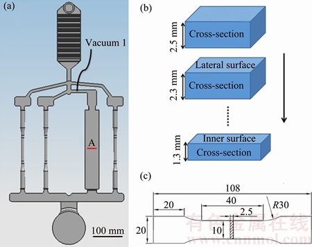 Fig. 2 Configuration of specific casting including three tensile test bars with diameter at center of 6.4 mm and one plate sample with thickness of 2.5 mm (a), observed surface from chilled layer to center (b) and tensile specimen (c) (unit: mm)