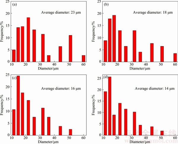 Fig. 7 Size distribution of primary silicon particles in planes at 0.4 mm depth in specimens produced at slow shot speeds of 0.05 m/s (a), 0.10 m/s (b), 0.15 m/s (c) and 0.20 m/s (d)