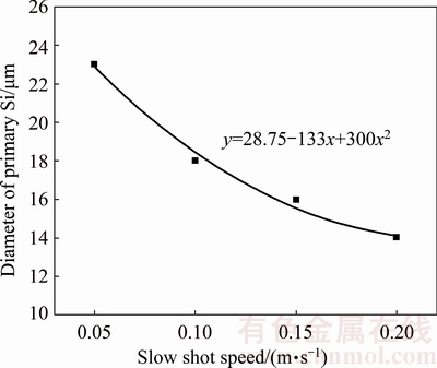 3) The average size of primary silicon decreased from 23 to 14 μm with slow shot speeds increased from 0.05 to 0.20 m/s. The primary silicon volume increased linearly and reached 12% at 0.85 mm. After that, the content of primary silicon kept steadily down to the center area. In addition, the primary silicon size has a binary functional relationship with the slow shot speed.
