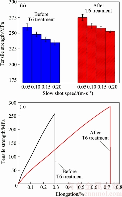 Fig. 9 Tensile strengths of 2.5 mm piece plates cast at different slow speeds before and after T6 treatment (a), and tensile strength-elongation curves of 2.5 mm piece plates cast at 0.05 m/s before and after T6 treatment (b)