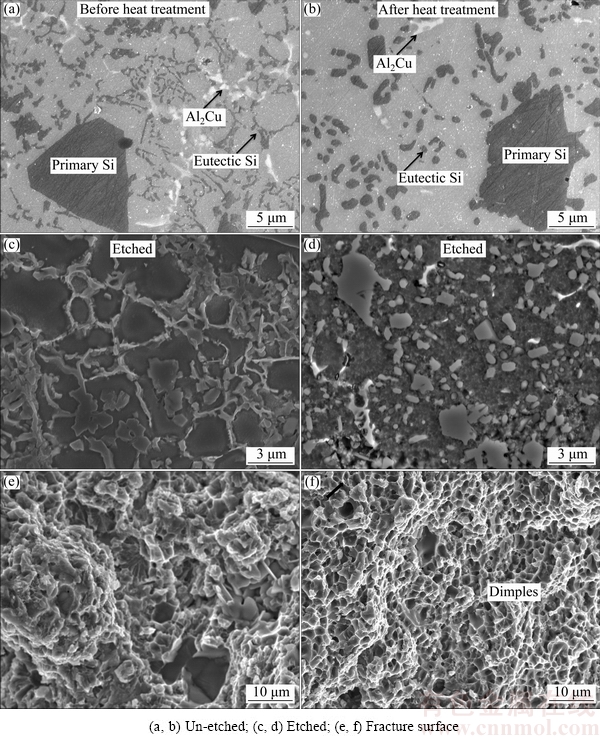 4) After T6 treatment, microstructural morphologies revealed that needle-shaped and thin-flaked eutectic silicon became rounded and Al2Cu was dissolved into α(Al) matrix. After T6 treatment, this brittle transgranular fracture turned into a fracture mode with many dimples.
