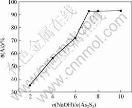 Fig.3 Influence of mole ratios of NaOH to As2S3 on leaching rate of As