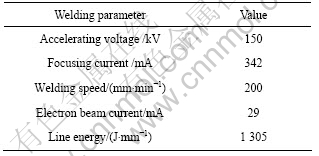 钛合金样品采用Ti-6Al-4V热轧板材,其化学成分如表1所列。采用电子束焊接,焊接试样尺寸为200 mm×180 mm×20 mm,焊缝垂直于轧向,位于试样中间,焊接工艺参数如表2所列。焊后热处理温度为650 ℃,保温4 h。电子束焊接设备采用北京航空制造工程研究所研制的ZD150-15A型和ZD150-30A型高压电子束焊机。