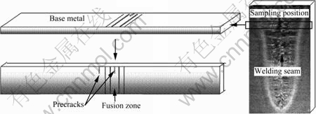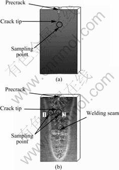 采用5%HF+12%HNO3+83%H2O溶液浸蚀焊接接头的不同区域,以便分区预制裂纹。为了进行对比研究,分别在母材与焊缝中心预制裂纹,预制缺口深度为0.2 mm。动态疲劳试验在SHIMADZU EA-10型电液伺服低周疲劳实验机上进行。采用拉-拉加载方式、加载频率f=5 Hz、应力比R= 0.1、正弦波形、最大疲劳应力σmax=392 MPa。每隔一定的加载循环次数后测定裂纹长度,当裂纹长度为a=0.5 mm时,停止疲劳 加载。