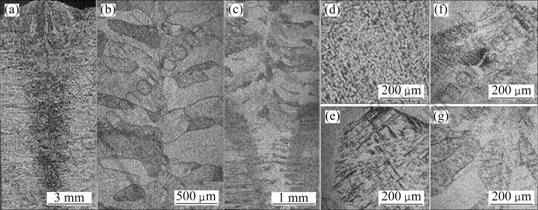 Fig.4 Morphologies of Ti-6Al-4V alloy in welded joint ((a), (b), (c)), base metal (d), upper part of welding seam (e), middle part of welding seam (f) and lower part of welding seam (g) in welded joint
